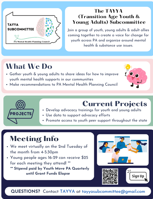 The TAYYA (Transition Age Youth and Young Adults) Subcommittee is a group of youth, young adults, and adult allies coming together to create an advocating voice for transition age youth across Pennsylvania regarding mental health and substance use issues.